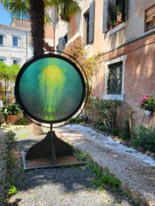 The dominant motif in Metamorphic Posthuman is the armillary sphere or spherical astrolabe, which is one of the defining characteristics of Rosa Mundi’s fertile imagination with her installation ‘Sfere Armillari 22’. Dating back to ancient times the armillary or spherical astrolabe is an astronomical device for representing the great circles of the heavens with a central sphere symbolizing either the Earth or the Sun. She has created her own unique version, consisting of three elliptical iron circles, set one inside the other, made from recycled iron from old, disused wine barrels from a Castle in Piedmont.